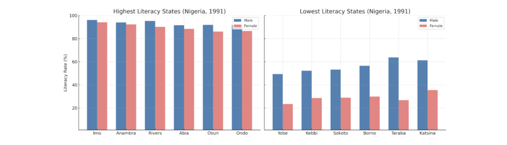 According to the World Bank (2003), Nigeria’s overall literacy rate in 1991 was about 56.7 percent, with a marked gender gap: 65.7 percent of males compared to only 47.8 percent of females (see Fig. 1). Among youth aged 15–24, 90.8 percent of young men were literate versus 63.6 percent of young women. As shown in Figure 1, southern states such as Imo and Anambra recorded female literacy rates above 90 percent, while northern states like Yobe, Kebbi, and Sokoto fell below 30 percent.