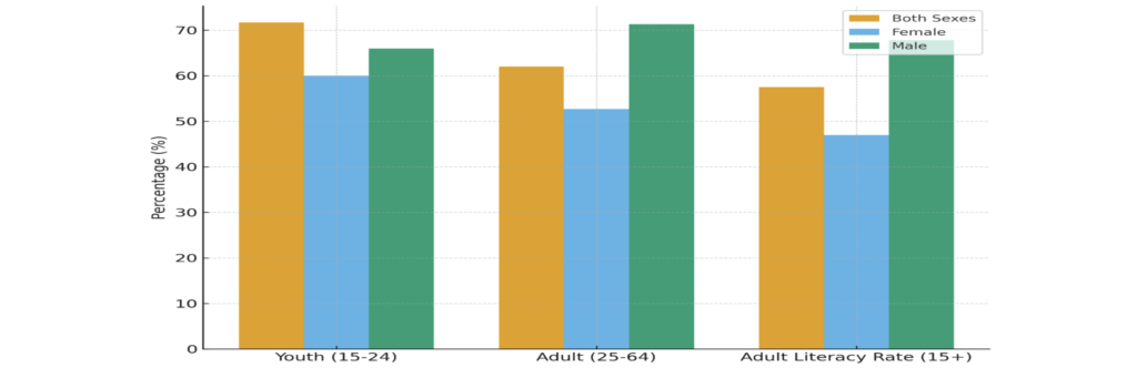 Nigeria’s literacy data reveal a systemic collapse—one that disproportionately affects women across their lifetimes. While the national youth literacy rate (15–24) is 71.7%, this figure masks a deep gender wound. Female youth literacy is only 60.0%, six percentage points behind their male peers. Among adults (25–64), the gender gap widens dramatically: only 52.7% of women are literate compared to 71.3% of men. This 18.6-point deficit indicates that the Nigerian system not only fails to educate girls equitably but also struggles to sustain literacy, setting women on a trajectory of accelerated disenfranchisement after leaving formal schooling.